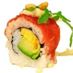 Geflambeerde zalm,zalm avocado,komkommer,unagisaus,japanse mayonaise