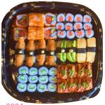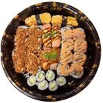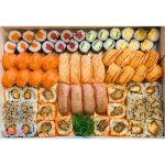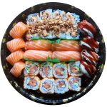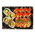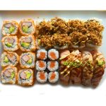 Geflambeerde zalm,kaas,komkommer,surimi,gefrituurde garnaal,japanse mayonaise