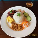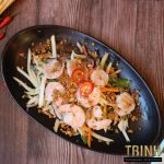 Cambodjaanse noedelsoep met kippenbouillon, rijstnoedels, kip, garnalen, taugé, lente-uitjes, rode uien, koriander, citroen, chilisaus en hoisin saus