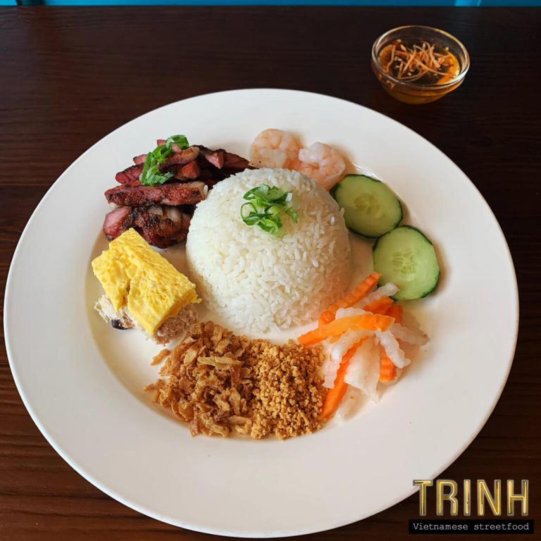 Rijstvermicelli met varkensvlees, springrolls, sla, komkommer, munt, gebakken uitjes, pinda, gezuurde groente, lente-uitjes en vissaus
