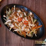 Rijstvermicelli met kip, springrolls, sla, komkommer, munt, gebakken uitjes, pinda, gezuurde groente, lente-uitjes en vissaus