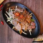 Rijstvermicelli met rundvlees, springrolls, sla, komkommer, munt, gebakken uitjes, pinda, gezuurde groente, lente-uitjes en vissaus