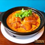 Curry noedelsoep met vermicelli, kip, garnalen, tofu, taugé, lente-uitjes, rode uien, koriander, citroen, hoisin saus en chilisaus