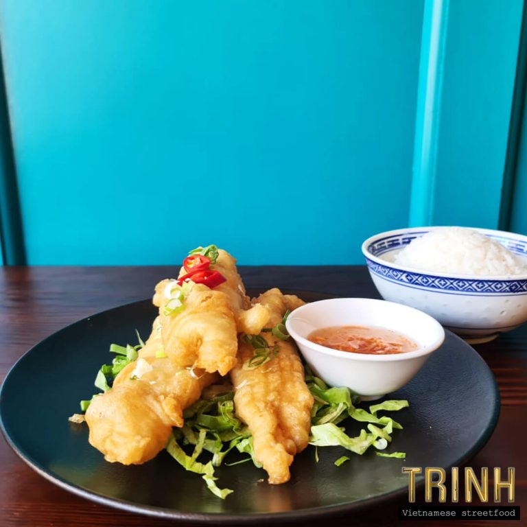 Rijstvermicelli met kip, springrolls, sla, komkommer, munt, gebakken uitjes, pinda, gezuurde groente, lente-uitjes en vissaus